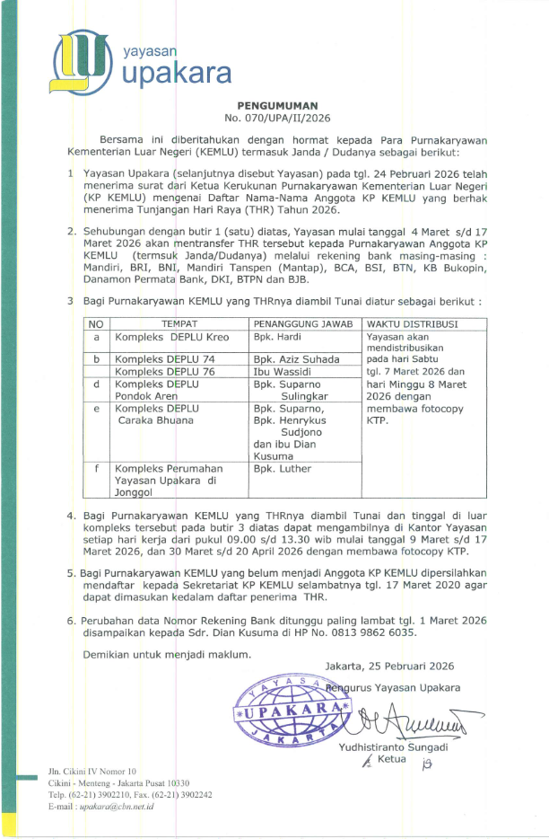 SK KETUA PENGURUS YAYASAN UPAKARA TTG JENIS-JENIS BANTUAN KESEJAHTERAAN UNTUK KARYAWAN DAN PURNAKARYAWAN KEMLU TAHUN 2026